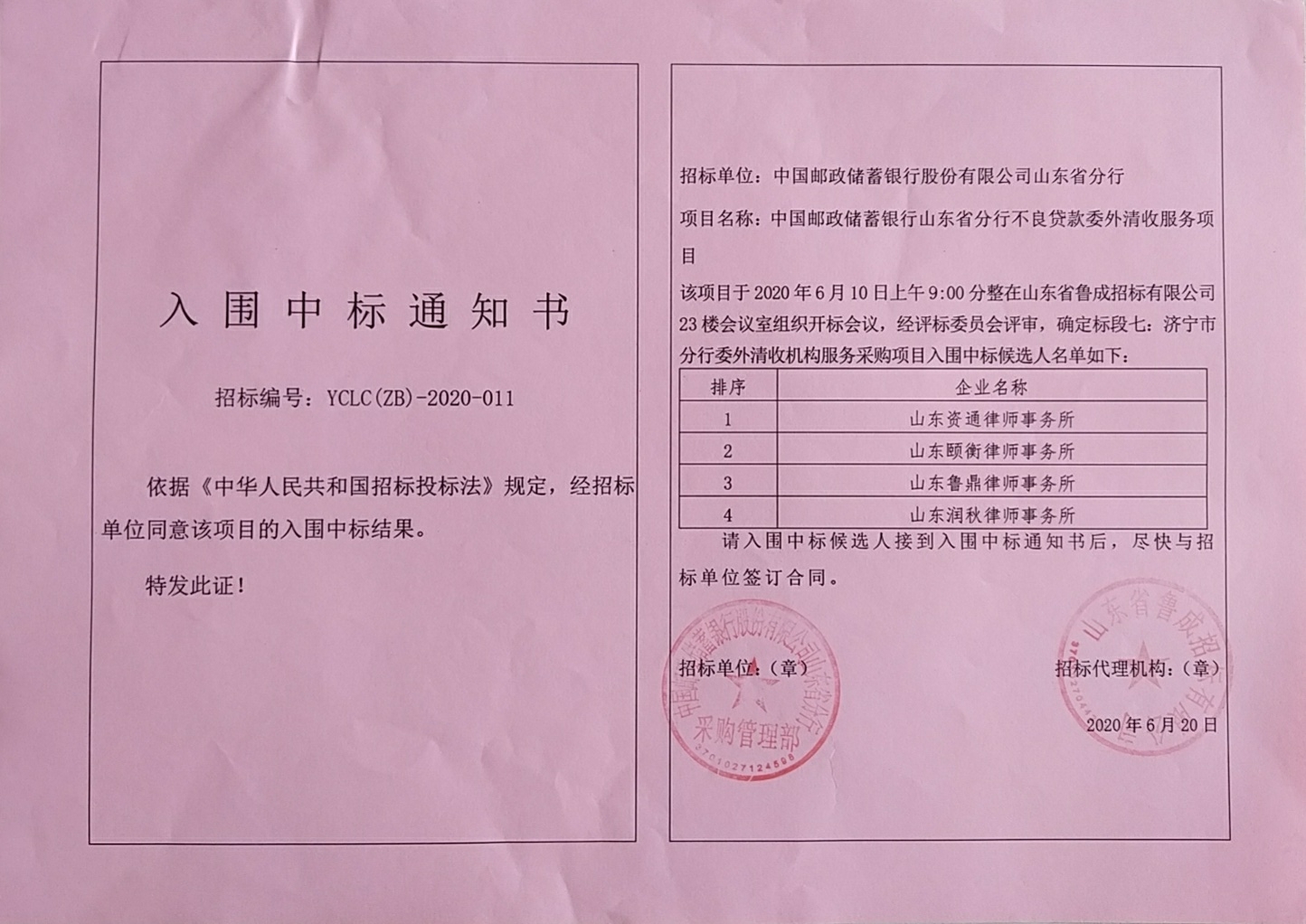 中国邮政网发布中标公告,确定山东润秋律师事务所入围中国邮政储蓄银行山东省分行不良贷款委外清收服务项目济宁市分行标段。